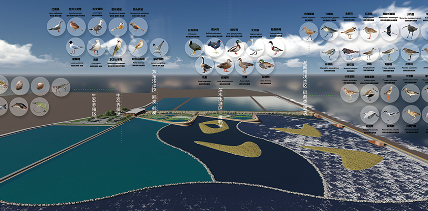 LOVE棲息地在潮間淺水區(qū)和深水區(qū)設計人工島棲息地,即水鳥高潮棲息地,棲息地通過不同水生池塘分為候鳥區(qū)和流鳥區(qū),可容納恒魚類、鴨類、鷺類水鳥,保證全天候的觀鳥體驗。