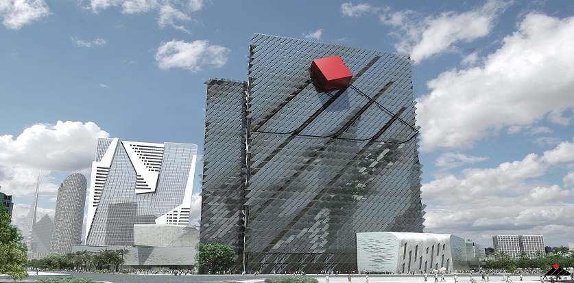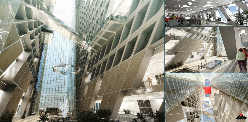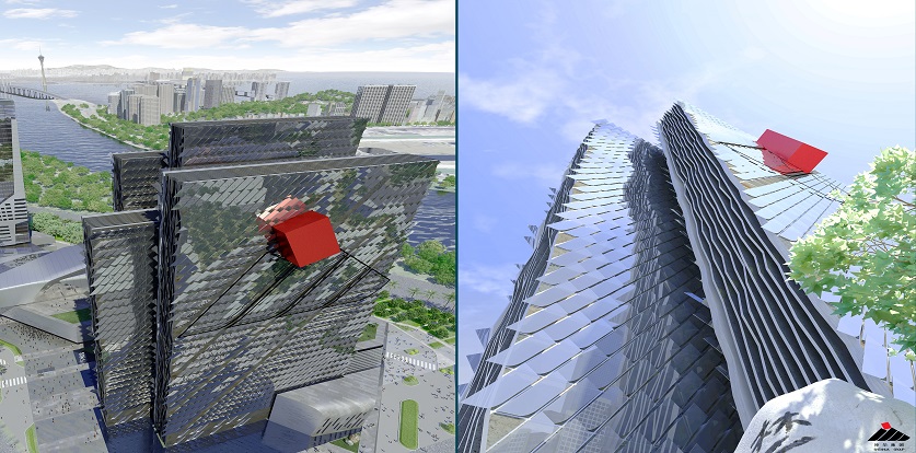 設計手法:配合該區(qū)域經(jīng)濟發(fā)展情況,在短期內(nèi)還需要建設高質(zhì)量的建筑物。成為城市性標志建筑。新總部形象需與自然融為一體,并與周圍的自然元素銜接,且在某種情況下可形成一面“鏡子”,通過一種特殊形式反射出這些形象:反射出天空的藍,反射出公園的綠、反射出海水的藍。設計了波浪狀的垂直立面,是考慮波動的立面可反射出更加逼真的形象。同時對總部辦公樓進行體量調(diào)整:整體形象為四個垂直棱柱,分別象征著神華集團里四所不同行業(yè)的公司。此設計理念主要基于神華集團的組織結構分布,外立面上醒目的集團標識也再次闡述了建筑的寓意。紅色的棱形柱,橫架于四個建筑物中,象征著燃燒的煤炭。該設計手法加強了對標志概念性的解讀。對于酒店,設計過程中不引入象征性元素。是基于其本身別具匠心的形象,該形象符合商業(yè)廣告的標準,設計過程引入了宏觀穿孔材料,以打造高水準客房。特殊的宏觀穿孔材料可“適應”窗口角度,不斷調(diào)整以指向天空,產(chǎn)生出兩種不同形象的效果,一種是為順應商業(yè)的標準,而另外一種則體現(xiàn)出其自然屬性。兩座塔樓,一座是總部辦公和及其基礎設施用房,另外一座是酒店,位于同一群樓的二者功能分布其中,視覺上又形成整體效果,打造出一個綜合體。會議中心設置在群樓上方,該設計理念則是源于一種自然設計的手法。總部的塔樓和酒店均為南北朝向,并合理地運用錯層式設計,使其坐看珠江和澳門海灣美景。